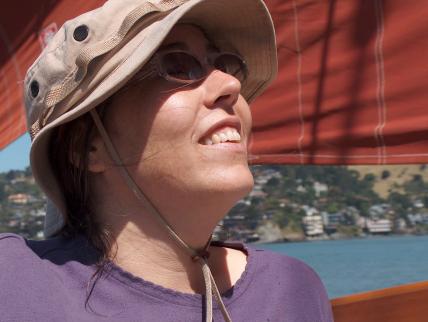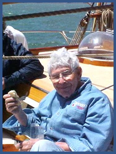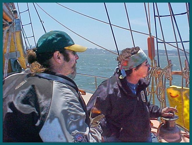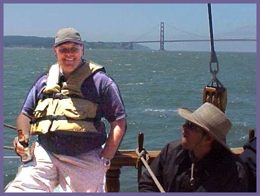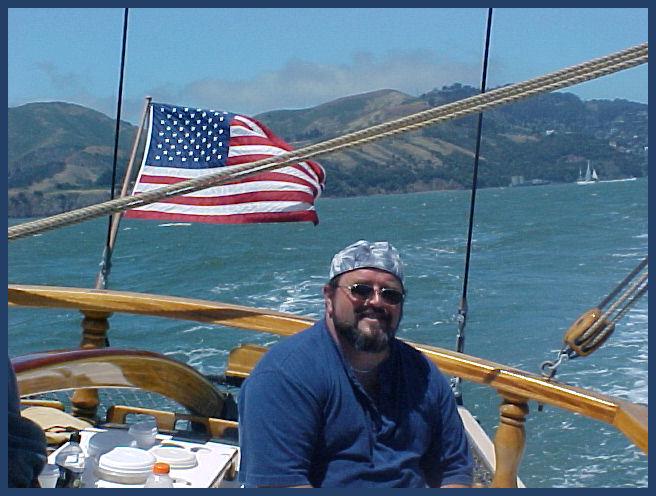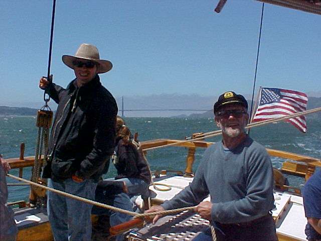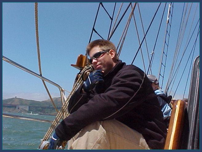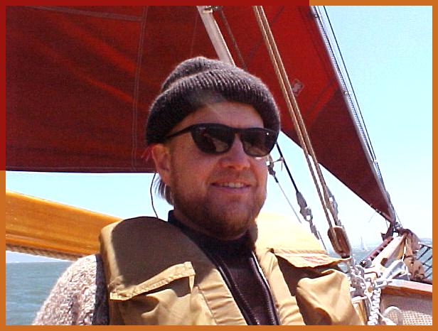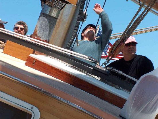 | (Photo lightened to show Russ's natty outfit.) Russ emailed me five years ago, a Darwin Awards fan excited that I lived nearby. He invited me sailing. I love to sail! For five full years, I intended sail with him. But maybe he was another Internet nutcase? So I vacillated. Finally I called him. "Russ! Let's go sailing!" "Worse luck, my boat's in drydock!" Fast forward two months. "Want to come to my Kaboom! party?" "Worse luck, I'm otherwise engaged!" A week passes. Russ calls. "Want to sail on a 70' schooner?" And here I am. |