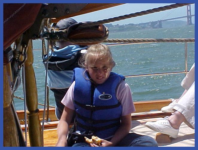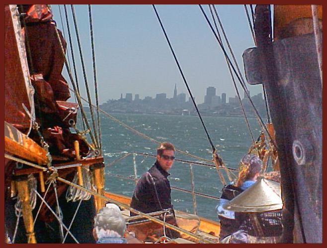 | We sailed past the Golden Gate Bridge more than once. We sailed, in fact, all over the bay. Aldebaran reached nearly 11 knots, coming back "downtown" from behind the Bay Bridge. |