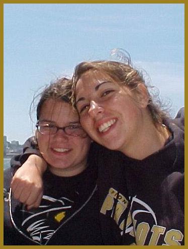 | The blue laser beams are again visible in this picture, happily pointing to the right of the camera. The Junior on the left has ambivalent feelngs about high school, which makes her pretty cool in my book, but drinking a grapefruit soda makes the world seem like a better place. The hugger is happy that the huggee is about to take a nap, or watch out later! Everyone smiles at the Captain, just to be safe. |